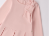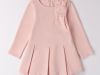 Abito per bambina Sarabanda realizzato in punto milano. Modello con apertura sul retro tramite zip invisibile, fiocco in applicazione, e parte inferiore plissettata. L’abito è in fantasia tinta unita. Lunghezza mini.
