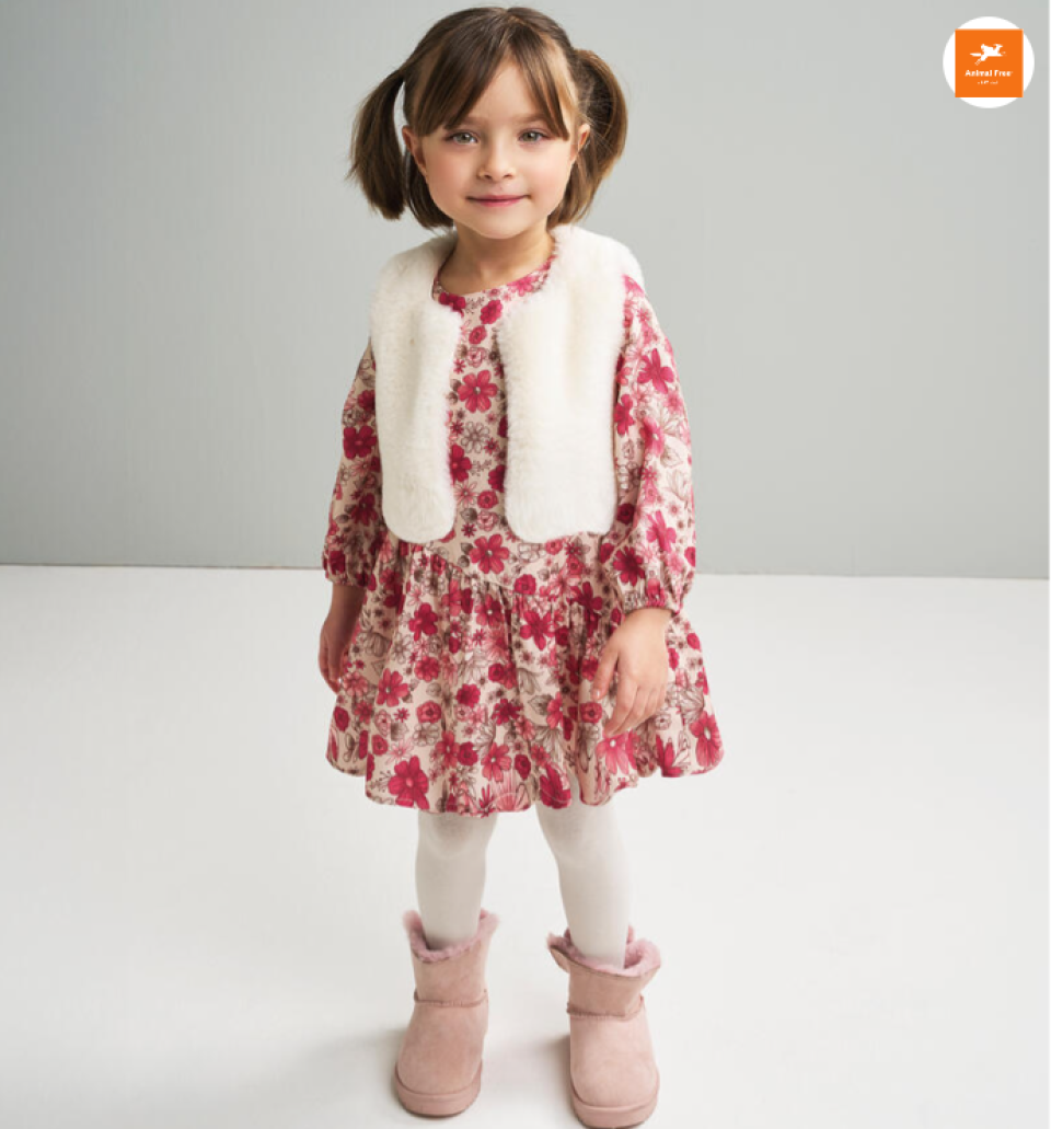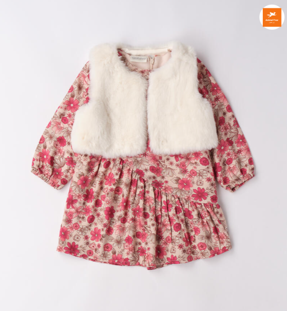 Abito per bambina realizzato in twill viscosa con fantasia a fiori. Lunghezza sopra al ginocchio. In abbinamento gilet in caldo e morbido tessuto. Il prodotto non contiene materiali di derivazione animale. Animal free è un marchio di LAV www.animalfree.info