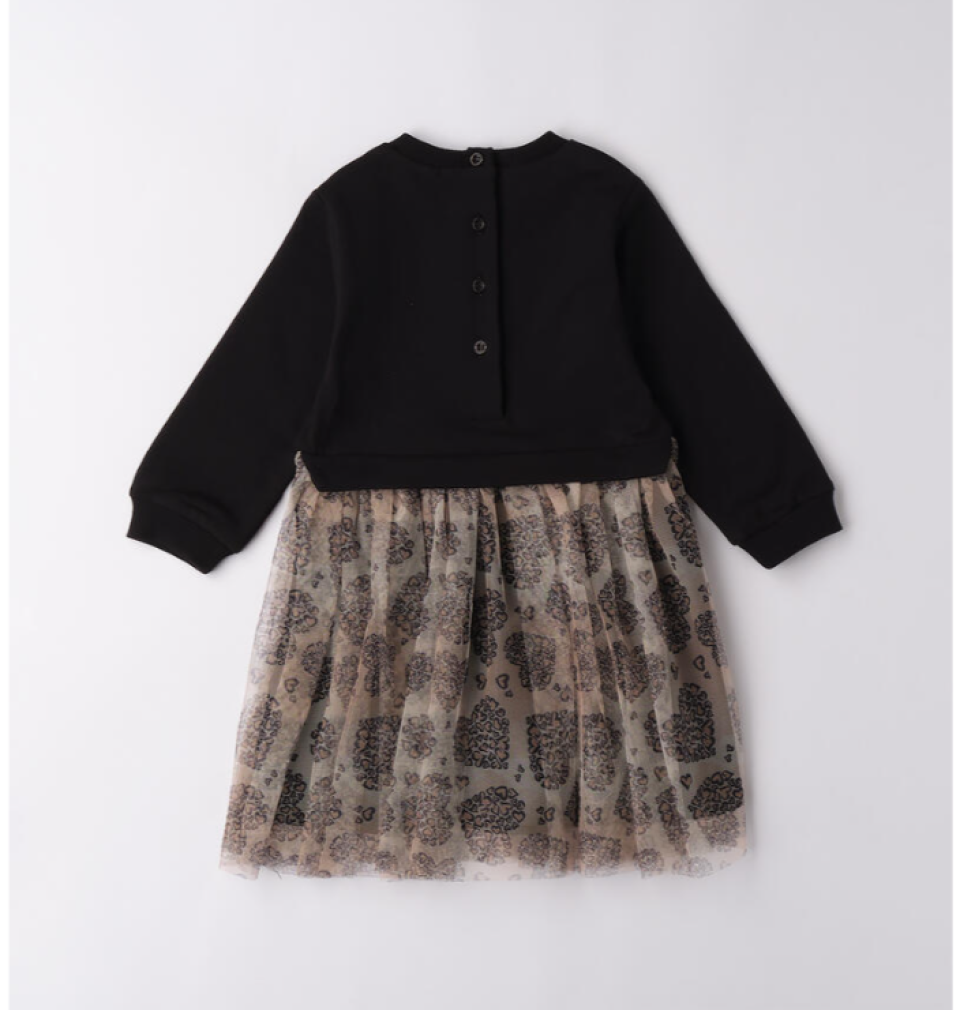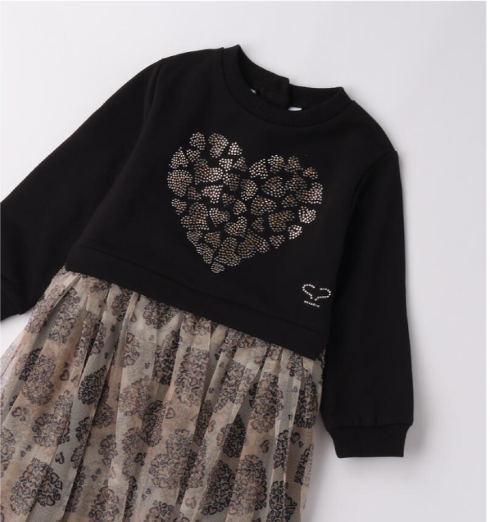 Abito per bambina Sarabanda realizzato in felpa invernale e tulle. La parte sopra è arricchita da cuore di strass. La gonna è foderata in satin. Lunghezza al ginocchio