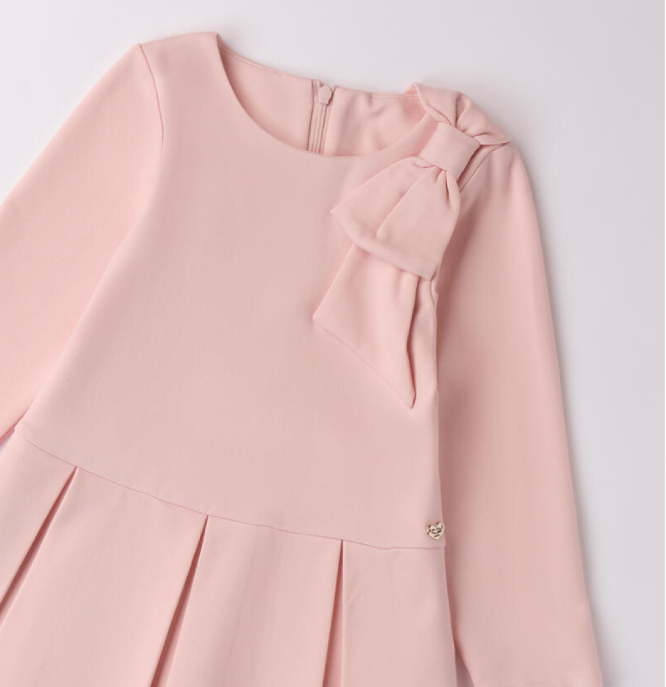 Abito per bambina Sarabanda realizzato in punto milano. Modello con apertura sul retro tramite zip invisibile, fiocco in applicazione, e parte inferiore plissettata. L’abito è in fantasia tinta unita. Lunghezza mini.