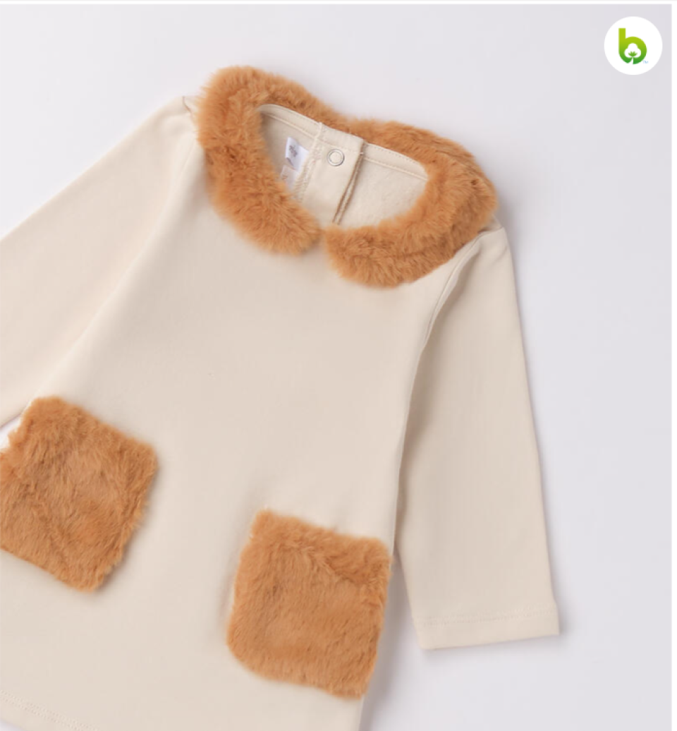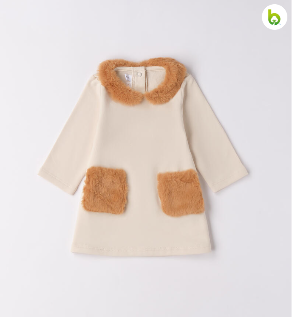 Abito per bimba Minibanda realizzato in felpa invernale di cotone stretch, felpata internamente, Tasche e colletto in morbido tessuto. Apertura dietro con bottoni a pressione. Lunghezza sopra al ginocchio.