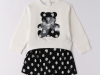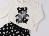 Completo per bambina Sarabanda. Il modello è composto da felpa e shorts. La felpa è in tessuto invernale con applicazione ricamo orso e fiocco in tulle. Short in jaquard fantasia allover.