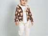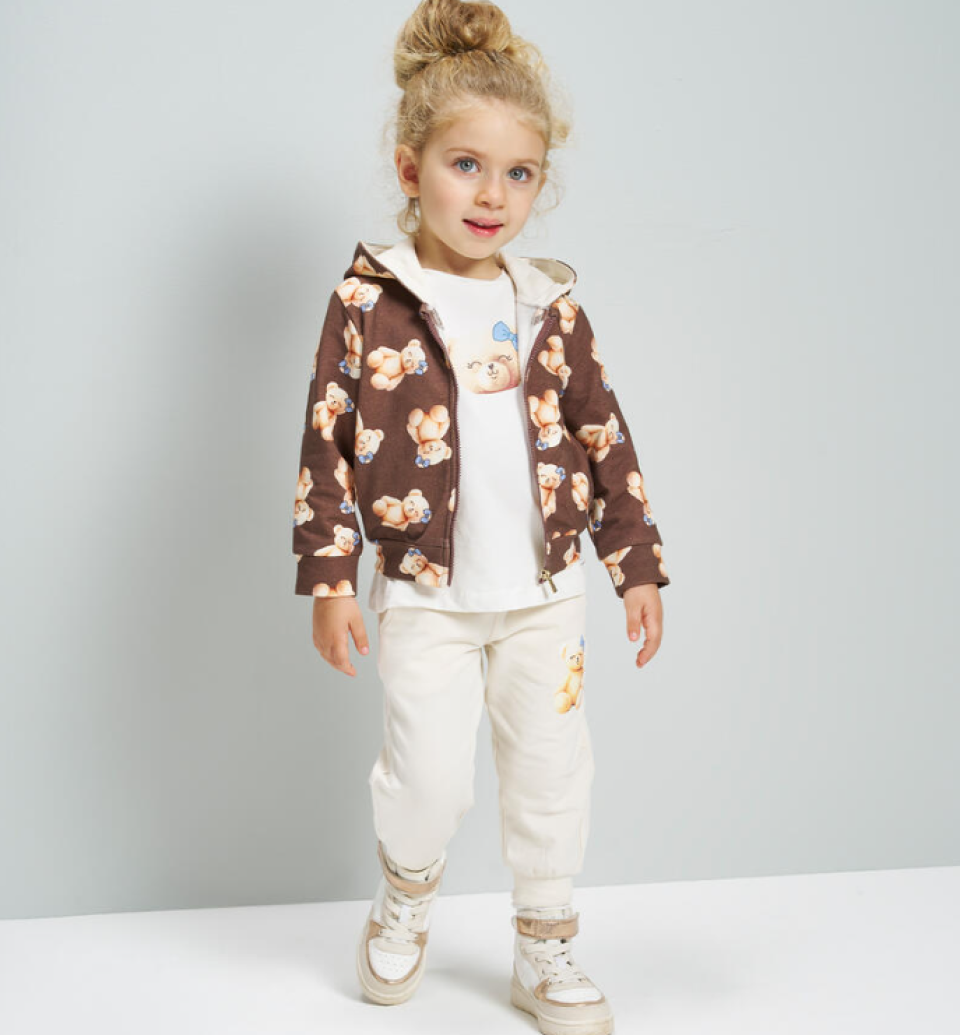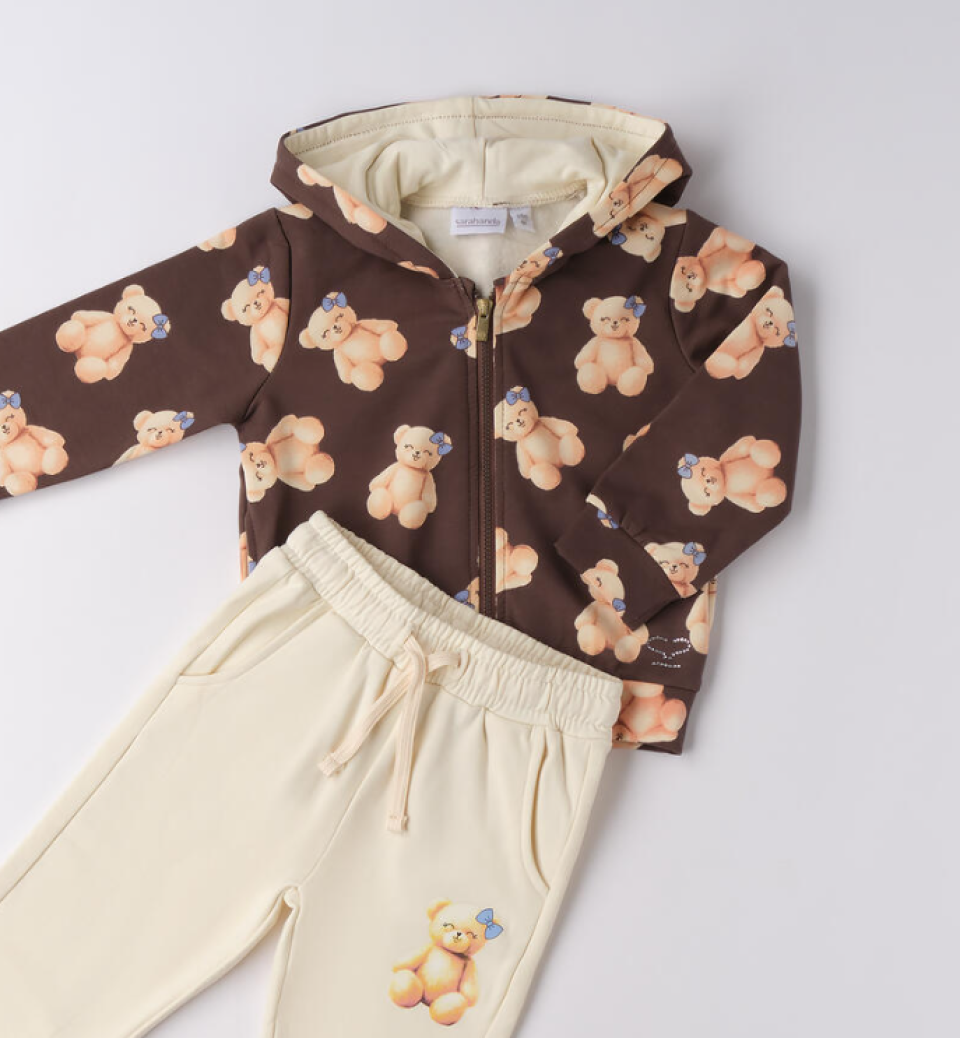 Tuta per bambina Sarabanda realizzata in felpa stretch con leggera garzatura. Felpa con cappuccio e tasche a marsupio. Stampa orsetti