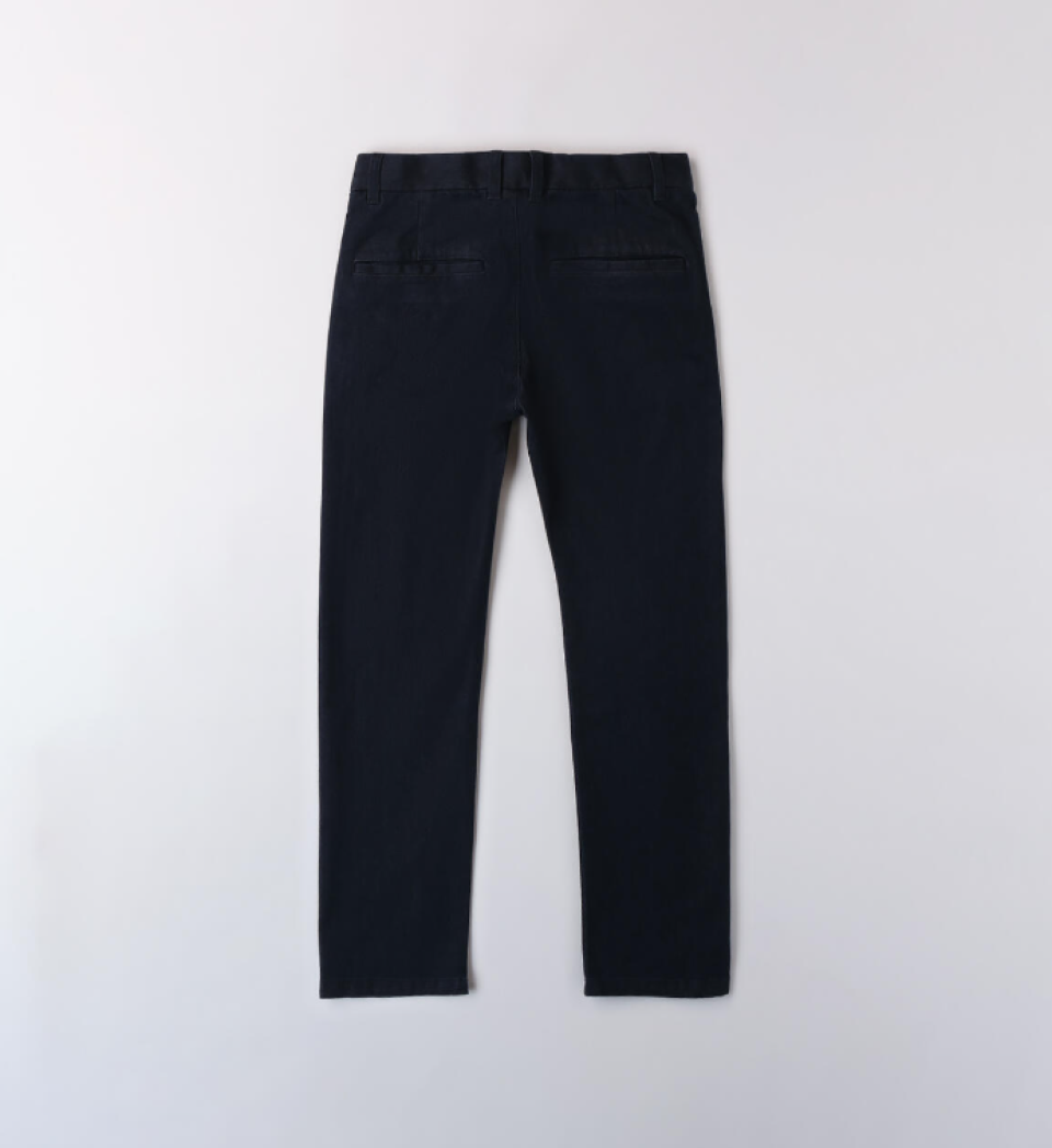 Pantalone ragazzo con cintura iDO in tessuto di viscosa effetto denim. Il modello presenta apertura con zip e bottone, cintura in vita, gamba dritta e fantasia tinta unita. Vestibilità regular. Misura vita regolabile con elastico asolato interno