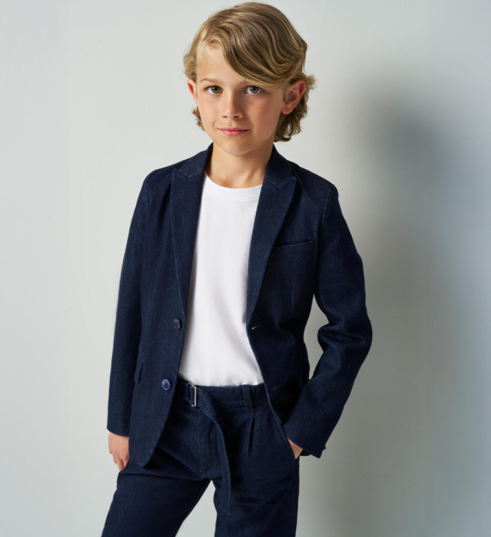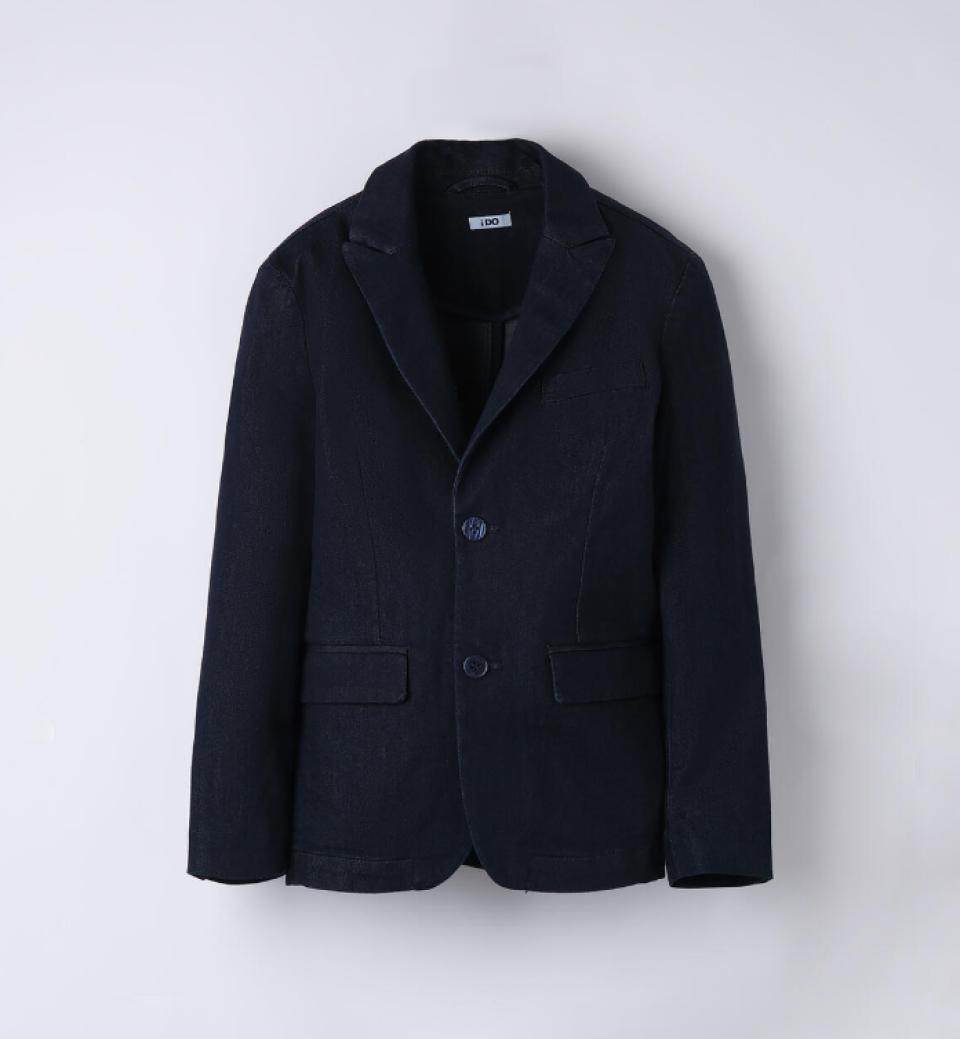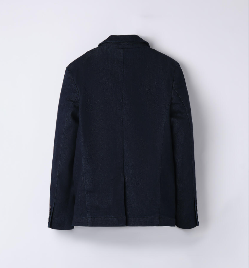 Giacca ragazzo iDO in tessuto effetto denim. Il modello presenta apertura frontale con bottoni, tasche laterali