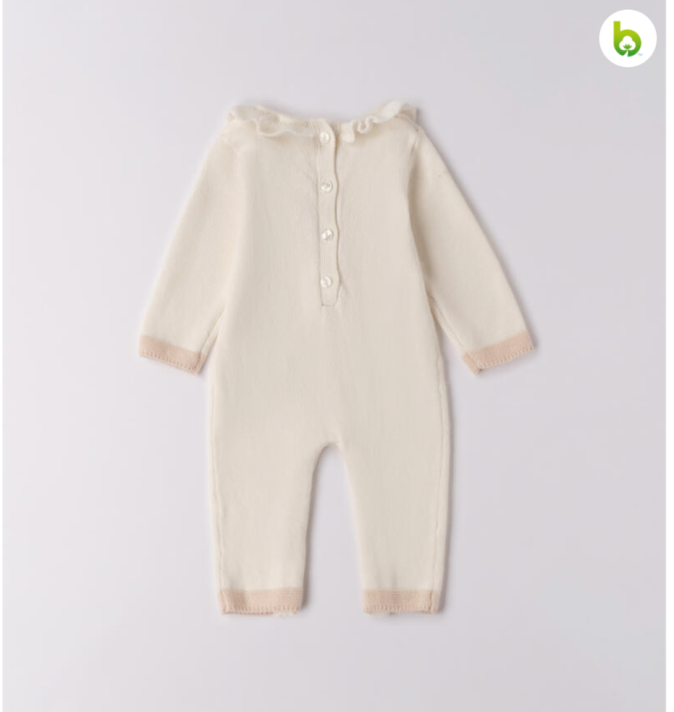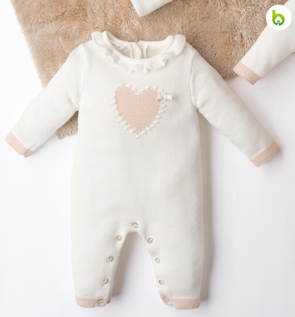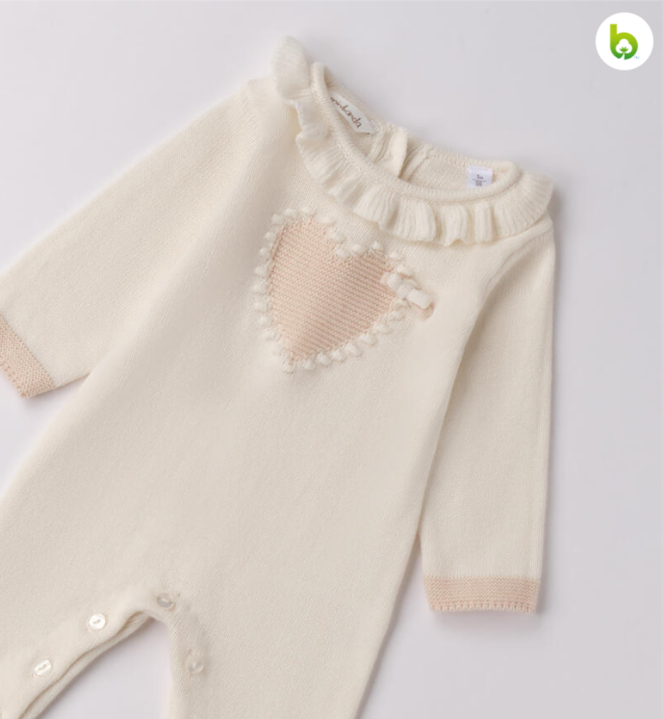 Tutina per bimba neonata Minibanda, realizzata in tricot cotone misto lana con cuore a intarsio. Il modello presenta apertura sul retro e nel sottogamba con bottoni per agevolare il cambio e la vestizione.